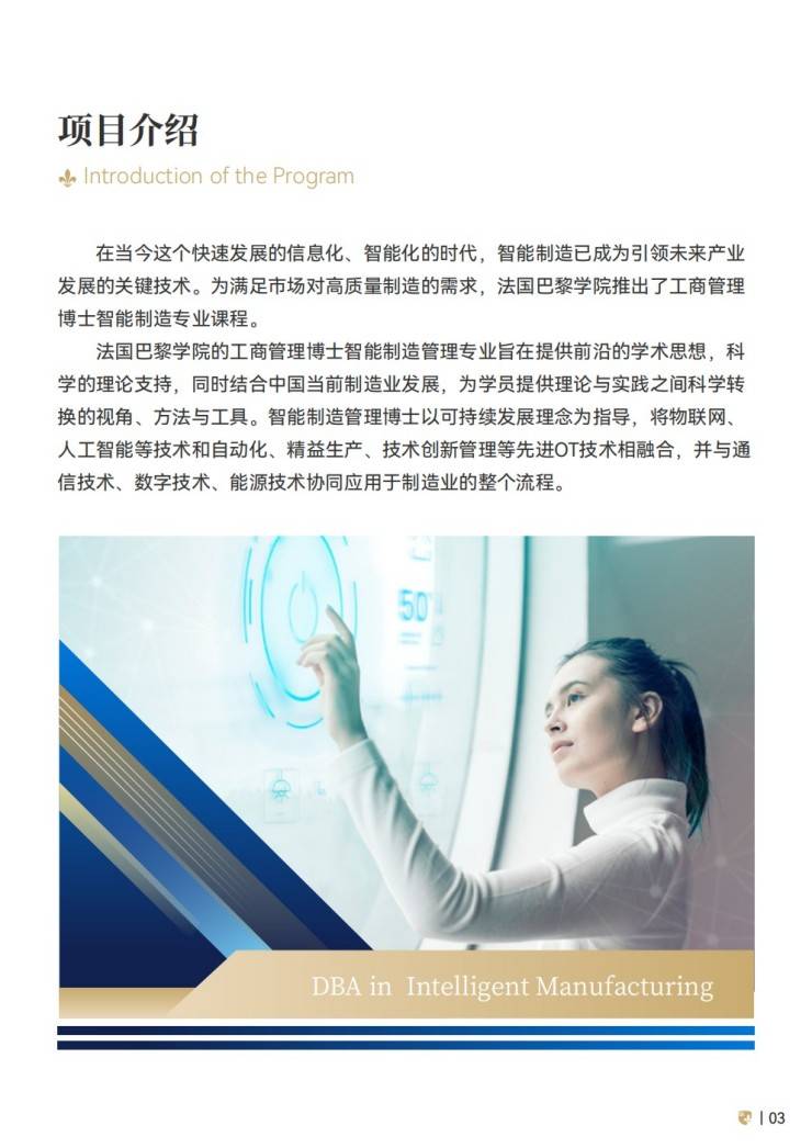 在当今这个快速发展的信息化、智能化的时代,智能制造已成为引领未来产业发展的关键技术。为满足市场对高质量制造的需求,法国巴黎学院推出了工商管理博士智能制造专业课程。法国巴黎学院的工商管理博士智能制造管理专业旨在提供前沿的学术思想,科学的理论支持,同时结合中国当前制造业发展,为学员提供理论与实践之间科学转换的视角、方法与工具。智能制造管理博士以可持续发展理念为指导,将物联网、人工智能等技术和自动化、精益生产、技术创新管理等先进OT技术相融合,并与通信技术、数字技术、能源技术协同应用于制造业的整个流程。