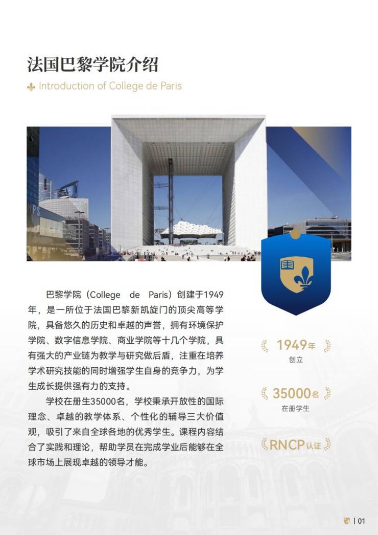 巴黎学院始建于1949年,是一所由十四所院校组成的私立高等学院,总部位于巴黎拉德芳斯(LaDéfense)金融商业区中心的新凯旋门(LaGrandeArche),分校分布在法国的巴黎、里昂、圣埃蒂安、克莱蒙费朗、尚邦、瓦朗斯、布尔日,以及美国、印度、阿联酋、喀麥隆等国家和城市,重点专业有:全球化设计、纺织品设计、服装设计、时尚与奢侈品管理、银行金融、数字营销与社交媒体、美食与美酒管理、全球MBA、人力资源管理学、环境管理、工商管理博士(DBA)、法语语言等。