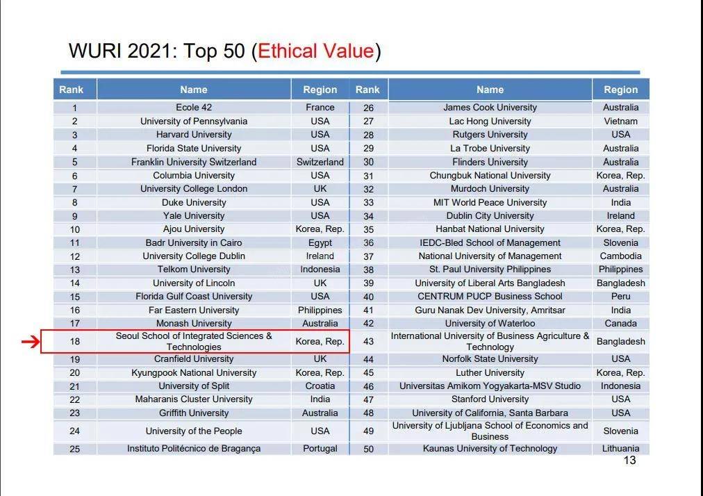 WURI排名评价委员会(委员长文辉昌国际竞争力研究院院长兼首尔大学国际研究生院名誉教授)于2021年6月10日在美国、欧洲、中国等全世界大学校长、教育相关人士、国际组织相关人士等200多人的关注下,在首尔和瑞士举行了网络会议,发表了2021年WURI排名。首尔科学科学大学院大学(aSSIST)在“道德价值”领域排名:世界第18位,“学生沟通及开放性”领域排名:世界第26位。