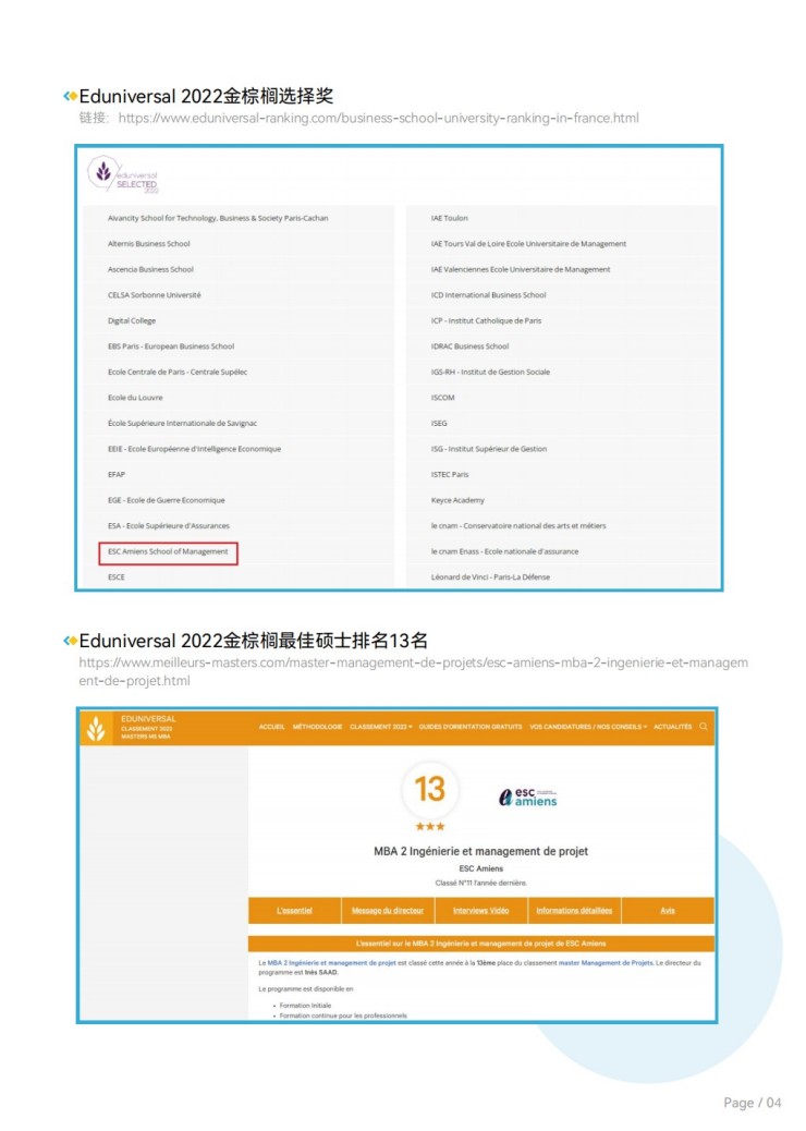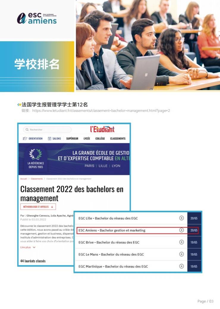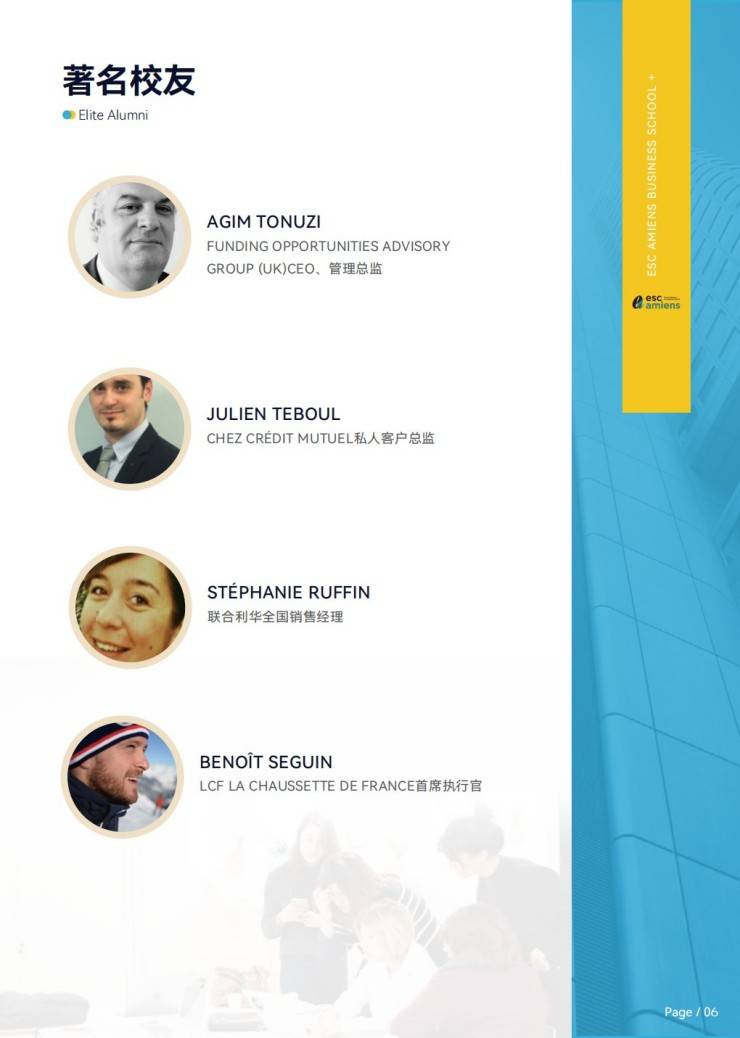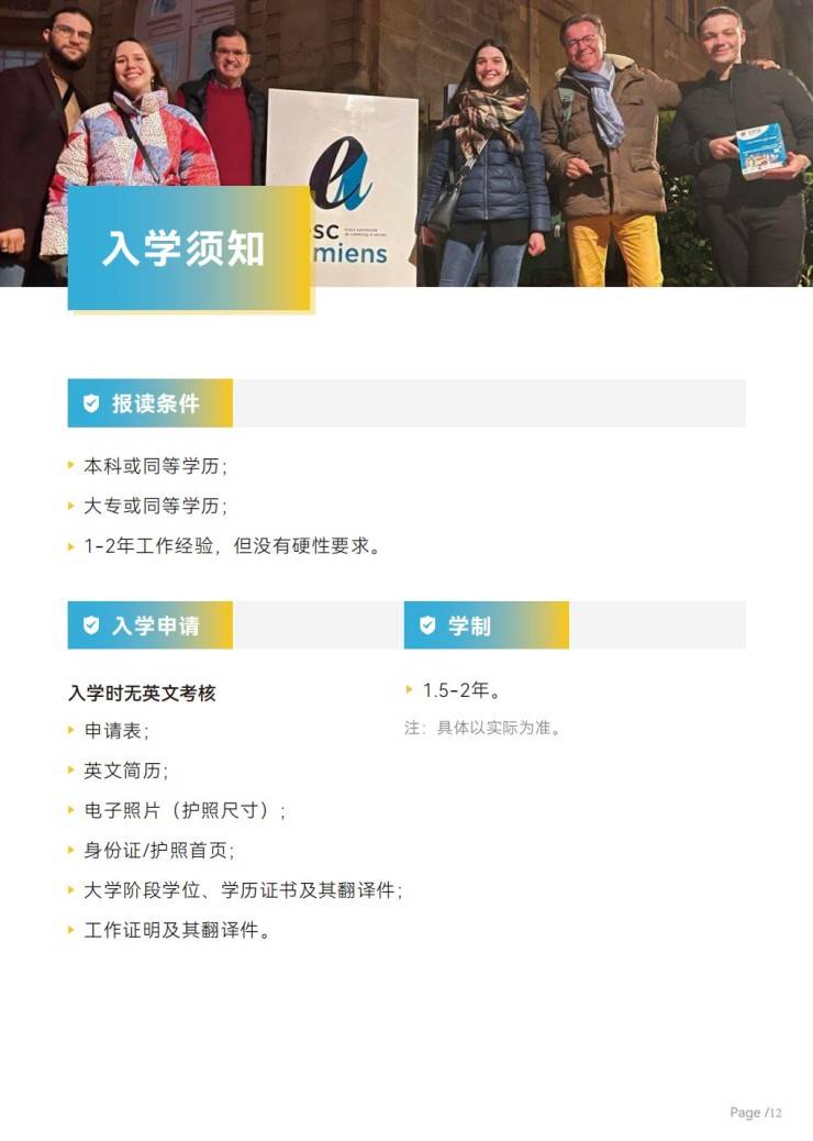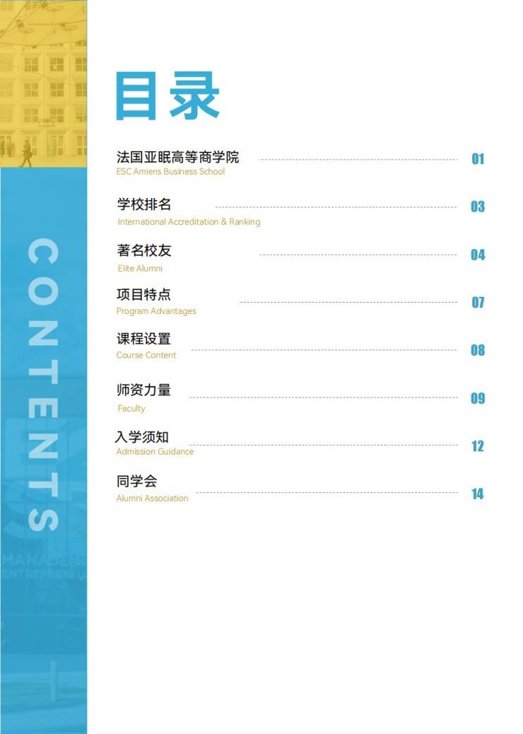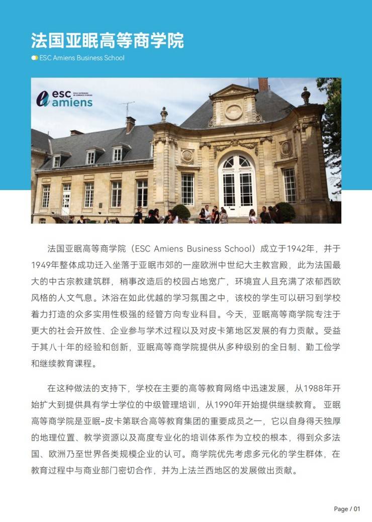 法国亚眠高等商学院创立于1942年,法国排名前20,一直致力于创新与发展。该校选址于亚眠大教堂旧址,此地区为法国最大的中古宗教建筑群。改造后的校园占地宽广,环境宜人且充满了浓郁西欧风格的人文气息。ESCAmiens着力打造众多实用性极强的项目方向专业科目:如创新管理、金融管理、保险证券管理、市场营销、运营及财务、高管技能及人力资源、经营技术工具等。