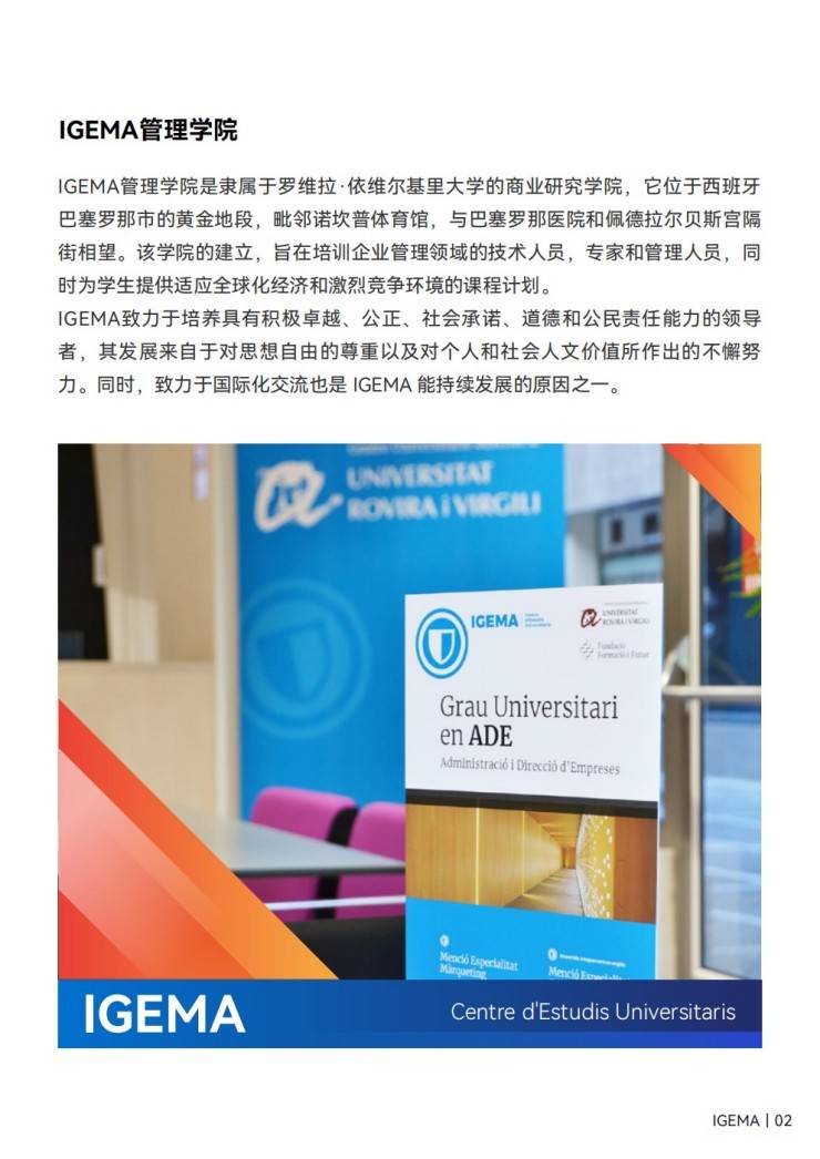 IGEMA管理学院是隶属于罗维拉·依维尔基里大学的商学研究中心,在西班牙教育文化与体育部(RUCT)的注册号为08072942,是未来教育基金会的下属机构,旨在培训企业管理领域的技术人员,专家和管理人员,同时为学生提供适应全球化经济和激烈竞争环境的课程计划。