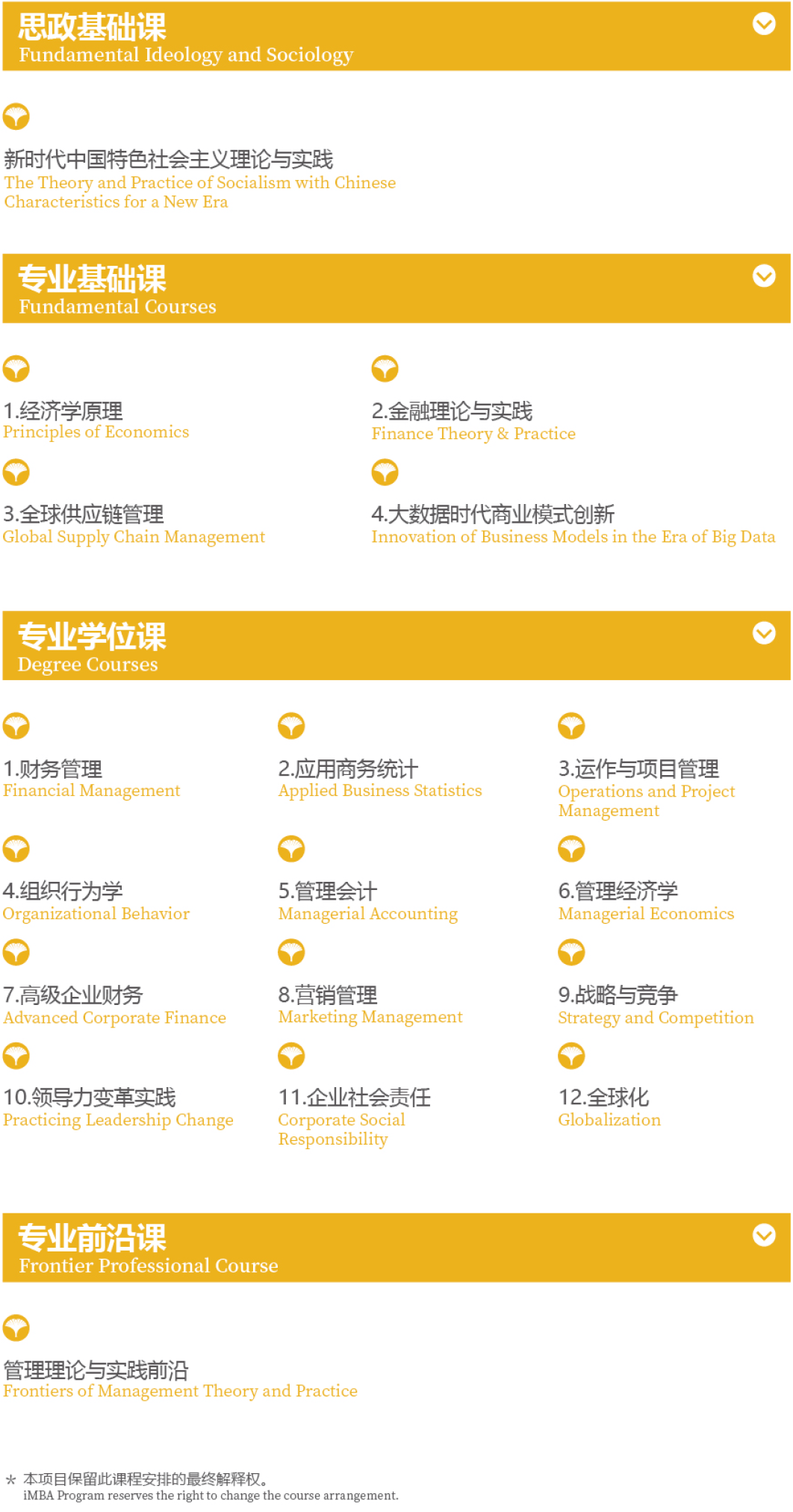 历经多年的发展与教学实践沉淀,iMBA项目成功汇聚了大批优秀的中外师资。项目紧密贴合最新的市场需求及学生特性,精心打造了18门精品课程。这些课程旨在培养学生的先进思维与国际视野,使他们能够积极、有效地应对复杂多变的商业环境挑战,从而成长为适应新时代发展的高级管理者及未来商业领袖。